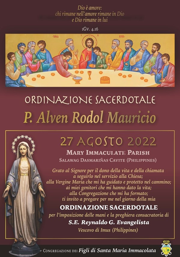 P. Alven sarà ordinato il 27 agosto 2022 nella sua Parrocchia Mary Immaculate a Salawag Dasmariñas Cavite, nelle Filippine.