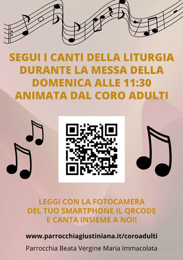 Basta aprire la pagina dedicata al coro degli adulti http://www.parrocchiagiustiniana.it/coroadulti, anche inquadrando con lo smartphone il QRCode disponibile sulle locandine all'ingresso in Chiesa, per avere i testi dei canti, cantare insieme al coro e vivere al meglio la liturgia.