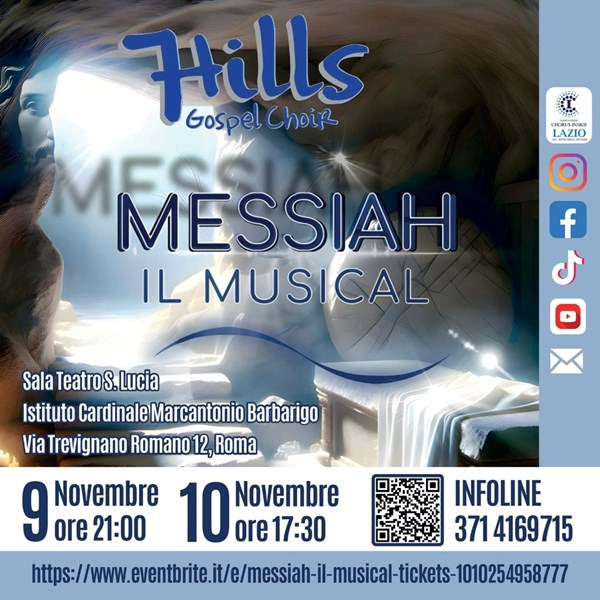 Segnaliamo lo spettacolo "Messiah - Il musical" dell'Hills Gospel Choir, che si terrà presso la Sala Teatro S. Lucia - Istituto Cardinale Marcantonio Barbarigo - Via Trevignano Romano, 12 - Roma nelle seguenti date: