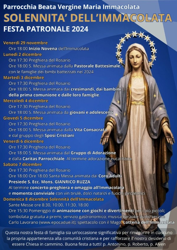 Carissimi parrocchiani, ci ritroviamo anche quest'anno per celebrare insieme la nostra festa patronale dell'Immacolata.