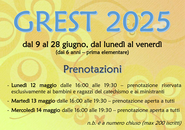 Nota bene: il Grest è a numero chiuso, si accettano max 200 iscritti