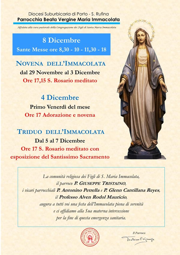 Ecco il calendario degli eventi in preparazione alla Solennità dell'immacolata.