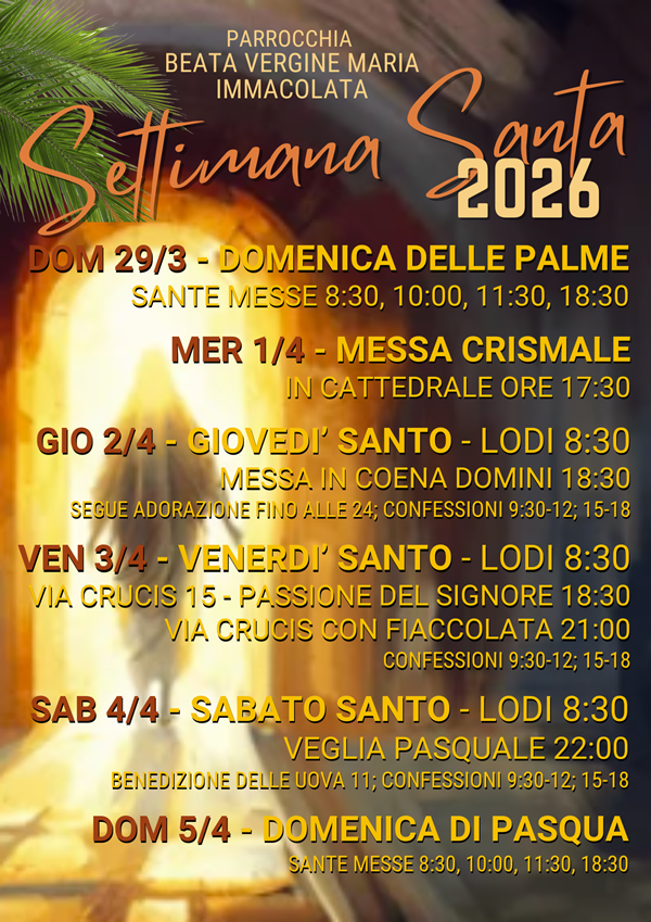 Carissimi parrocchiani, vi comunichiamo gli orari delle celebrazioni della Settimana Santa.